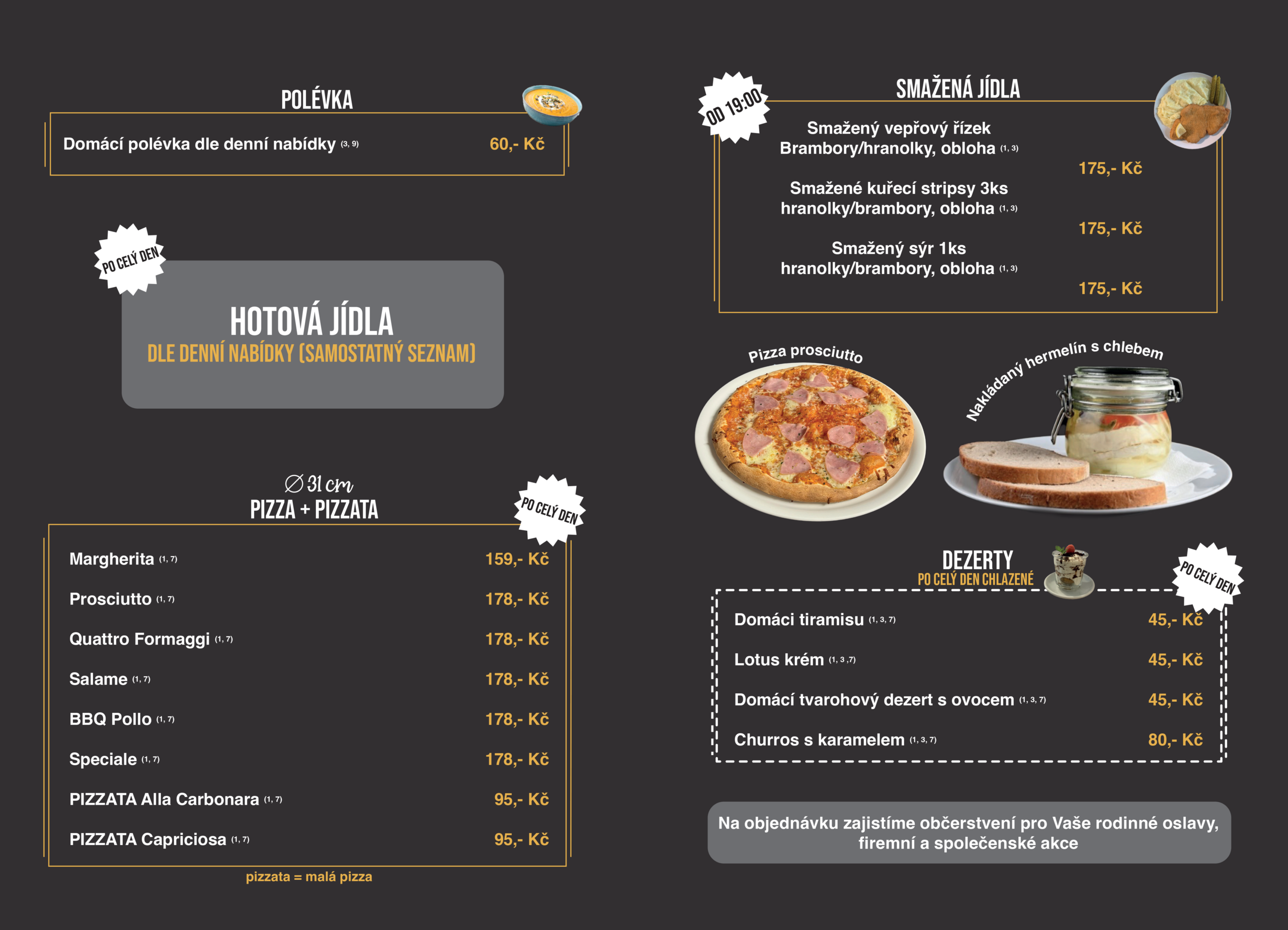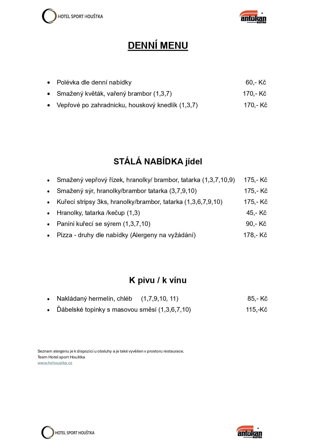 Vážení hosté, náš jídelní a nápojový lístek neustále rozšiřujeme a obměňujeme. Proto se může stát, že na webu není vždy uvedena aktuální verze. Pro upřesnění nás prosím kontaktujte telefonicky.